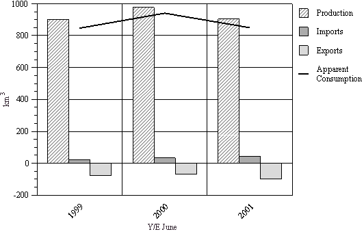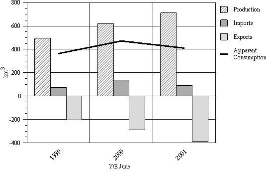 • Imports for 2000/01 fell 17 km3 (15 percent) to 97 km3. Shipments from New Zealand were 31 km3 (32 percent of the total) and from Indonesia 26 km3 (27 percent).