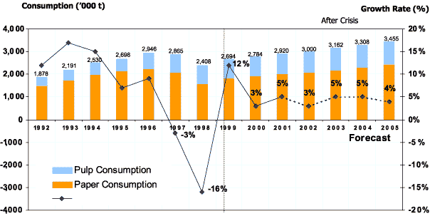 Domestic pulp demand in the next four years is expected to grow by 4 percent per annum from 896 000 tonnes in 2001 to 1 043 000 tonnes in 2005 as a result of the continuously rising demand in the paper industry.