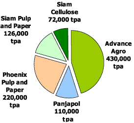 In line with the expected growth in pulp demand, there is a new entry namely "Thai Pulp Paper Industry Co., Ltd" which is expected to come on-stream by July 2003 for 100 000 tonnes per annum of short fibre pulp. Phoenix Pulp and Paper Public Company Limited, however, has delayed a capacity expansion of another 250 000 tonnes per annum to be due for a start-up in 2004 instead of the previously scheduled date of 2003.