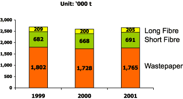 Total domestic fibre consumption was 2 661 000 tonnes, an increase of 65 000 tonnes or 2 percent over 2000. The waste-based material requirement accounted for the biggest portion of approximately 1 765 000 tonnes or 66 percent in proportion. The consumption for short fibre and long fibre were 26 percent and 8 percent respectively (see Chart 3).