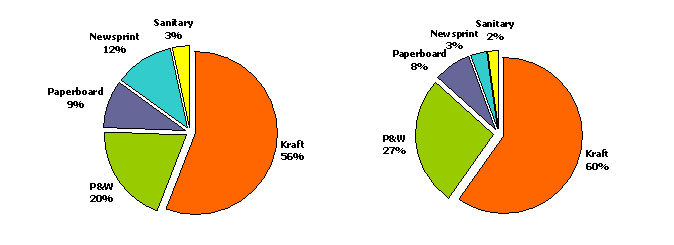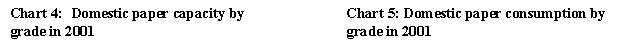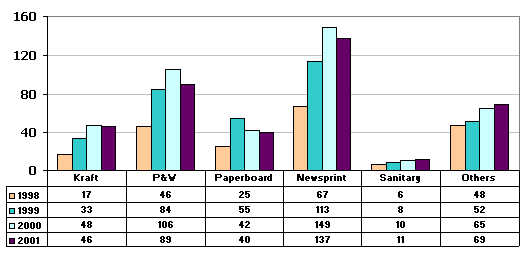 Total pulp and paper capacity reached 4 634 450 tonnes: 958 000 tonnes for pulp and 3 676 450 tonnes for paper. These figures have increased by 1 percent from 2000 mainly due to machine modifications and de-bottlenecking programmes. The industry utilization rate moderately improved from last year by 5 percent to 72 percent.
