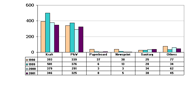 In 2001, the short fibre pulp consumption increased by 3 percent from 2000 to 691 000 tonnes, resulted from the growing in paper production level. To fully utilize the mills, the major producers had to export the surplus capacity of 346 930 tonnes, mainly to China, Australia, Republic of Korea and China Taiwan.
