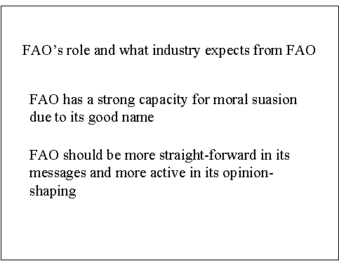 Networking and meetings (the role of FAO as a neutral forum) will facilitate consultation and collaboration between governments, the private sector, NGOs and civil society.