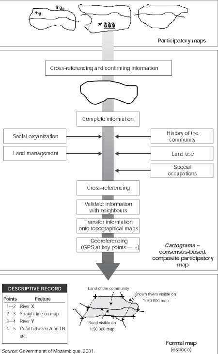The Technical Annex addresses these weaknesses by defining methods to identify, delimit and register community land rights acquired through occupation according to customary practices. The process is initiated by a sensitization and awareness-creation campaign to inform community members about the land legislation and their rights. According to the philosophy of the Technical Annex, the sensitization process takes the form of a series of meetings organized mainly by NGOs that are dealing with the land issue. The involvement of NGOs in this process is not explicitly stated in the Technical Annex, but is a practical fact. Figure 1 gives a brief overview of the practical steps and procedures that are used.