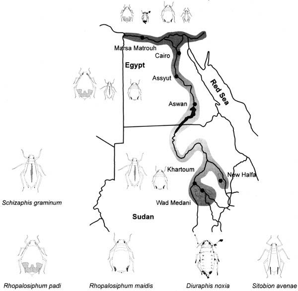 Wheat in Egypt and Sudan is grown in the tropical environments of the Nile River Valley and in large irrigated farms managed by farmer cooperatives. Several common aphid species attack wheat along the length of the Nile River Valley (Table 23.2), although the dominant aphid species change with increasing mean temperatures as one moves southward (Miller, 1994) (Figure 23.1). Rhopalosiphum padi (L.) causes the most serious yield losses in Middle and Upper Egypt, averaging 18 percent in unsprayed bread wheat and 16 percent in unsprayed durum wheat (Mossad et al., 1992; Tammam and Towfelis, 1992). High populations of R. padi literally desiccate wheat plants, causing extensive brown patches in infested wheat fields (Plate 58) (El Heneidy et al., 1991, 1992). Rhopalosiphum maidis (Fitch) is the dominant aphid species in the more temperate northwest coast, and though it vectors barley yellow dwarf virus (BYDV), it rarely causes notable direct damage to the plant. Sitobion avenae (F.) and Diuraphis noxia (Kurdjumov) rarely attain population levels high enough to warrant control efforts in Egypt. Schizaphis graminum (Rondani) is commonly observed on wheat throughout Egypt, but is rarely considered harmful there (Plate 59). However, S. graminum may attain sufficiently high densities in Sudan to cause the same type of direct feeding damage as R. padi does to the north in Egypt (Sharaf El Din, 1992). Direct damage to wheat in Sudan by S. graminum may result in up to 30 percent yield losses in unsprayed fields (Kannan, 1992). Rhopalosiphum padi, while present in Sudan, is generally observed earlier in the growing season than S. graminum in Sudan, and populations never attain high densities.