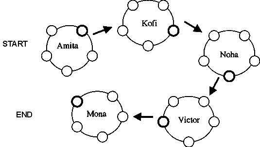 The illustration below shows how a 5-person ROSCA would function. At each meeting, all members contribute an equal amount to make a lump-sum that is distributed at the end of the meeting. At the first meeting, Amita gets the lump sum. At the next meeting, Kofi receives it, and so on, until all members have received the lump sum once. This completes one cycle.