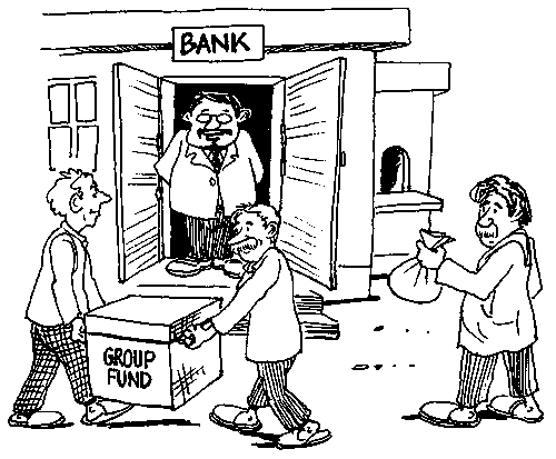 Some rules-of-thumb on linking-up Rule 1: Discuss the idea first with all members of the group. Examine the advantages and disadvantages. Find out what the minimum requirements for opening a bank account are. Do members agree with these conditions? Rule 2: Save up enough money to make the initial savings deposit. Rule 3: Choose at least two trusted members (usually the group Chairperson and Treasurer) to visit the bank/credit union to inquire about opening a group banking account. Rule 4: Ask the person in charge of handling new accounts to explain in details the terms and conditions for opening a group account. Rule 5: Make sure the name of the group is made the title of the account rather than the name of an individual member of the group. You will need to provide one address to the bank when opening the account. Rule 6: Ensure the joint signatures (for example, of the Treasurer and the Chairperson) are required on all deposits and withdrawals to the account. Two or three persons should be the co-signatories to the account in such a way that at least two or all three together can withdraw from the account. Rule 7: Upon depositing the funds, demand a signed receipt indicating the title of the group account, the account number, the amount deposited and the balance, like a savings passbook from the bank. |