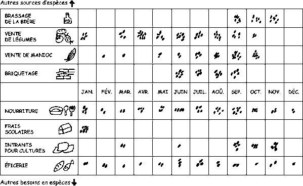 Les besoins financiers varient d'un mois à l'autre, selon les obligations familiales, les exigences de la saison des récoltes et de la saison des plantations, etc. En savoir plus sur ces variations saisonnières aidera les gens à répartir et économiser leurs ressources de manière plus efficace pour équilibrer sur l'année leurs besoins de consommation.