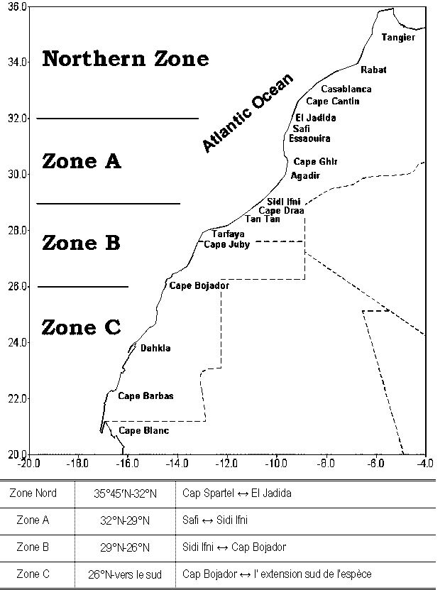 La Figure 1 montre les zones de pêche de la sardine au large de la côte de l'Afrique du nord-ouest. Le modèle de migration de la sardine dans les zones A (32oN - 25oN) et B (29oN - 26oN) ont été étudiées en utilisant des informations sur les activités de la flotte commerciale et des résultats des campagnes acoustiques (Belvèze et Erzini, 1983). A la fin de l'automne et au début de l'hiver, on observe un mouvement perpendiculaire de la sardine vers la côte quand les géniteurs se déplacent vers le littoral pour se reproduire. On observe également un mouvement saisonnier de sardine le long de la côte.