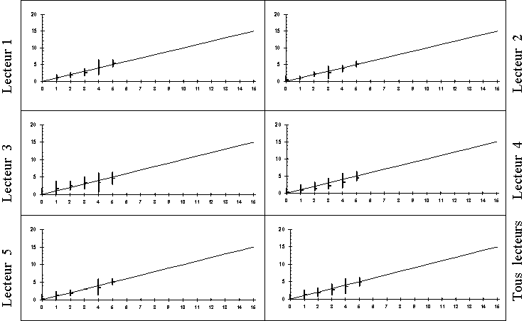 Le biais de la lecture d'âge si l'on considère tous les lecteurs combinés est de moins de 0.40 ans (Tableau 3). Cependant, le lecteur 4 présente une tendance élevée à sous-estimer l'âge, principalement pour des individus ayant plus d'un an.