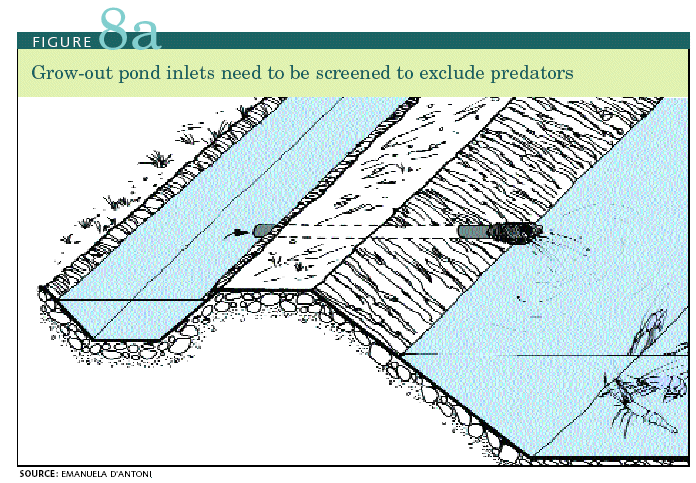 Screened inlets being used in this freshwater prawn grow-out pond (Peru)