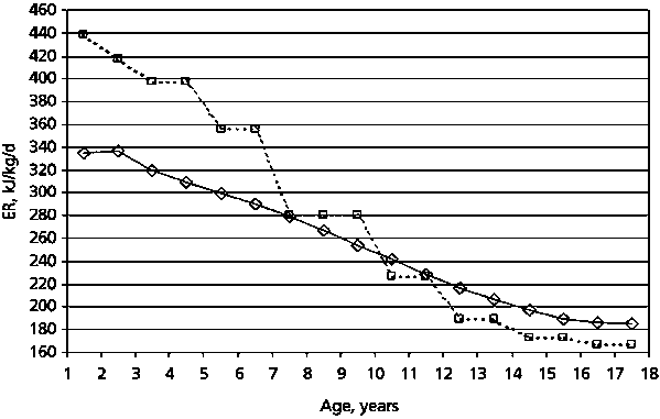 New values for energy requirements of infants, children and adolescents were proposed since they had been overestimated for children under ten years of age and underestimated for children 10 years or older and adolescents (see Figure 1).