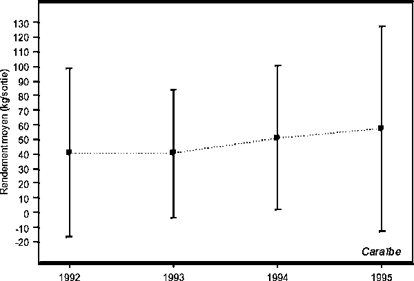 Les captures moyennes annuelles par sortie oscillent entre 40.8 et 57.7 Kg. Une augmentation de ces captures par sortie est observée entre 1992 et 1995. Ces rendements sont significativement différents (test de Kolmogorov Smirnov) entre 1992 et 1993, 1993 et 1994 mais pas entre 1994 et 1995 (fig. 4).