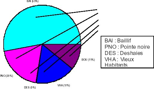 La zone géographique concernée est la côte caraïbe de Basse Terre. Les points de débarquement les plus suivis ont été Baillif (54 % des fiches), Vieux Habitants (20 %), Pointe Noire (17 %), Bouillante (7 %), (fig. 1 et 2). Environ un millier de fiches correspondant chacune à une sortie journalière ont été récoltées chaque année auprès dune dizaine de pêcheurs (fig.3).