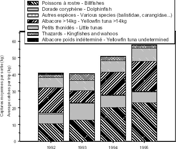La composition spécifique des captures montre que laugmentation importante des prises de poissons à rostre et dans une moindre mesure de thons de plus de 14 kg explique laccroissement des débarquements moyens par sortie entre 1992 et 1995. Cette augmentation des captures de gros pélagiques est due au développement de la pêche à la palangre verticale dérivante à un hameçon («pêche au bidon»), qui a permis dexploiter des profondeurs plus importantes autour des DCP ancrés. Cette technique était pratiquée traditionnellement par les pêcheurs de Baillif sur les hauts fonds pour capturer les albacores adultes et a été utilisée par la suite autour des DCP ancrés. Les autres espèces (ou groupes despèces) capturées sont les dorades, les petits thons de moins de 14 kg et les thazards (fig. 5).