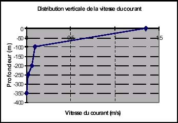 Dans le Tableau 2, le courant a sa vitesse maximale en surface, décroît à 0.1 m/s à 100 m de profondeur, puis est nul à la profondeur du corps-mort.