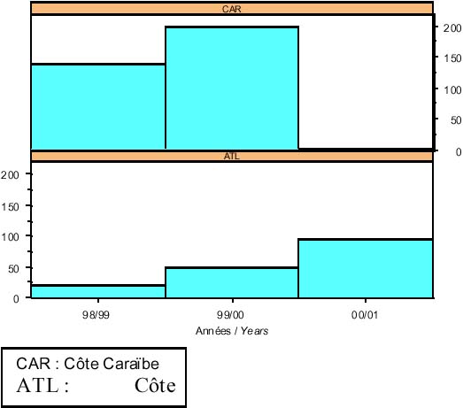 Si lon compare les captures moyennes par sortie DCP calculées à partir des données de Martinique et Guadeloupe, on observe que les rendements obtenus en Guadeloupe sont sensiblement plus élevés quen Martinique, bien que les périodes étudiées ne soient pas les mêmes (Tab.2). Les résultats indiquent une tendance à la hausse mais le faible nombre dannées échantillonnées impose une extrême prudence concernant leur interprétation.