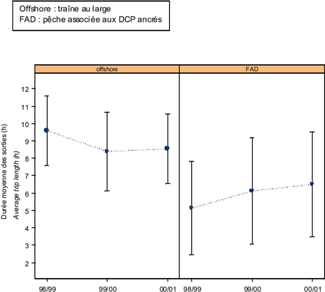 Il faut noter que lutilisation de «bidons» semble entraîner une augmentation des captures moyennes par sortie mais également de la variabilité des prises. En effet, la capture dun seul gros pélagique augmente considérablement le rendement par rapport à une sortie durant laquelle le pêcheur na capturé que des thonidés juvéniles. Ceci contribue à une variabilité importante des prises par sortie.