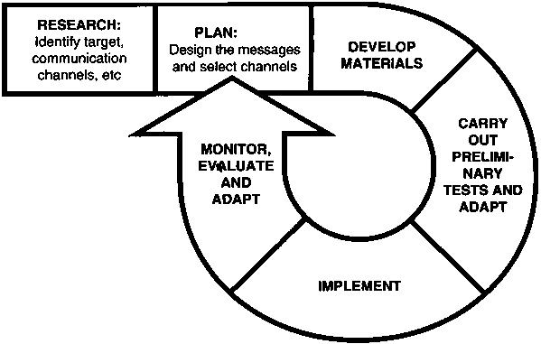 Finally, it is important to note that communication for development aims at a change in (or adoption of) by a target group and, on a longer-term basis, at social change. From this point of view, sustainable behavioural change is a long-term proposition and involves, in addition to issues of communication, other factors such as the availability, accessibility and quality of services, the socio-cultural and political context, the level of education and the socio-economic circumstances. In the African context, it also supposes a certain amount of social change, given the influences of relations and social structures on the individual. The following steps are taken.
