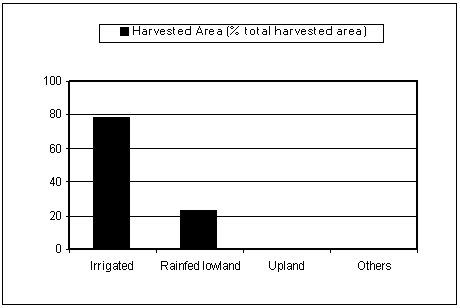 Only 20 to 25 percent of the total rice areas are under rice-rice systems. Land preparation is done either under dry condition (about 20 percent), dry-wet conditions (about 43 percent) and wet conditions (37 percent). Direct seeding is the main method of crop establishment, although a number of farmers are practicing transplanting nowadays. During dry season, seeding is done with seed drill, while during wet season it is done with aeroplane. Majority of rice farms belong to farmers' co-operative or state farmers, the remaining belong to individual households. The following table shows the rice varieties planted in the country.