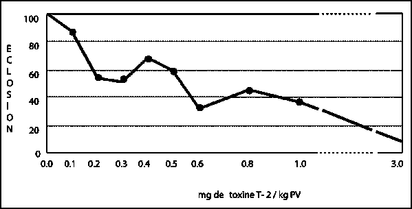 FIGURE 52. Effet du niveau d'ingestion de toxine T-2. Pénalisation de l'éclosabilité des ufs fertiles (base 100 = éclosion normale).