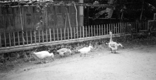 Il y a des limites dans l'emploi des diverses matières premières qui peuvent entrer dans un régime d'oies. La présence de toxiques, leur coût ou leur disponibilité sont autant de facteurs qui limitent l'utilisation de ces ingrédients. En Asie, le riz, le maïs et leurs dérivés sont les constituants majoritaires des rations pour les oies. Dans certaines régions, le sagou ou le manioc entrent également dans leur ration. Les sources de protéines sont: le tourteau de coprah, le soja ou la farine de poisson qui entrent dans la composition des aliments concentrés. Une supplémentation en herbe est intéressante pour couvrir les besoins alimentaires. La consommation journalière est variable, elle dépend de l'âge des oies et des autres constituants qui lui sont fournis. Les déchets de cuisine peuvent également constituer un apport substantiel et contribuer à l'équilibre de la ration (figure 5). Le grappillage d'aliments par les oies en système extensif est une pratique très répandue. Un troupeau d'oies composé de 4 à 20 unités est capable de trouver son alimentation et d'entretenir les abords d'un petit village. Les oies peuvent également être maintenues dans des conditions moins libérales: dans des enclos proches de la maison du fermier, des canaux, des lacs ou des rizières où on leur autorise un accès contrôlé. Elles sont alors nourries avec des déchets de cuisine et tout ce qu'elles peuvent trouver dans le périmètre qui leur est alloué. En ce qui concerne les oies en production, le pic de ponte oscille entre 20 et 45 pour cent en fonction du système d'alimentation. Les ufs produits selon cette méthode sont vendus individuellement sur les marchés (figure 6), la collecte de ces ufs et leur conservation n'offrant pas toujours toutes les garanties en matière d'hygiène. Les systèmes d'élevage des petits producteurs sont parfois mal maîtrisés et les programmes alimentaires mal adaptés. On fait beaucoup confiance aux méthodes traditionnelles (alimentation à base de riz uniquement), ou naturelles (couvaison par une oie ou une cane), mais ces méthodes ne permettent pas d'obtenir les résultats optimums.
