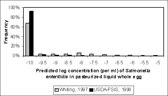 The resultant contamination levels predicted by the exposure assessments are shown in Figure 4.23. The Whiting and Buchanan (1997) distribution predicts generally greater levels of contamination per millilitre of liquid whole egg before pasteurization. Much of this difference results from the greater egg contamination frequencies modelled in that analysis. The mean log concentration is -2.1 for the Whiting and Buchanan (1997) distribution and -2.6 for the US SE RA distribution. If Whiting and Buchanans high and low flock prevalence scenarios were considered separately, the resulting distribution would be shifted to the right and left, respectively, of the distribution shown in Figure 4.23.