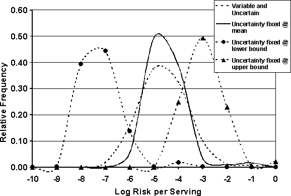 Figure 7.3. Effects of uncertain parameters on per serving risk distribution.