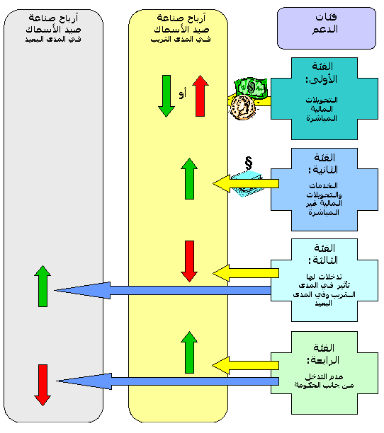 وكما يمكن أن نرى، يقوم هذا التصنيف على آلية تأثير الدعم، أي ما إذا كان يقوم أو لا يقوم على تحويلات مالية مباشر (الفئتان الأولى والثانية)، وما إذا كان يؤدي إلى إحداث تغيير في أرباح صناعة الصيد في المدى القريب أو المتوسط أو البعيد (الفئة الثالثة)، وما إذا كان يتضمن اتخاذ إجراءات من جانب الحكومة أم لا (الفئة الرابعة). وتتطابق الفئتان الأولى والثانية - باستثناء بعض الخدمات المعينة التي تؤديها الحكومة مثل إدارة مصايد الأسماك - مع التعاريف التي تطبقها منظمات، مثل منظمة التجارة العالمية، بينما تنطوي الفئتان الثالثة والرابعة على منافع ضمنية (أو أضرار) على صناعة الصيد.