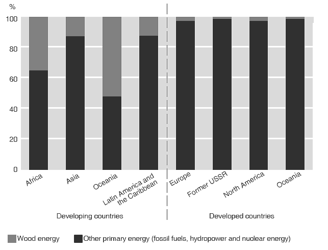 In the developing countries, wood energy represents approximately 15 percent of total primary energy consumption, although this figure conceals differences at the subregional and national levels (Figure 2). For example, in 34 countries in these regions woodfuels provide more than 70 percent of energy, and in 13 countries they provide 90 percent or more.
