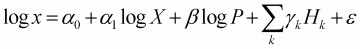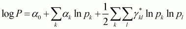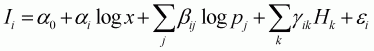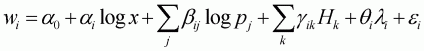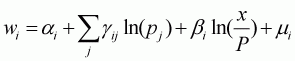 where wi is the budget share of good i; pj is the price of good j; x is the total expenditure of the goods in question; mi is the random disturbances assumed with zero mean and constant variance; and P is a translog price index defined by: