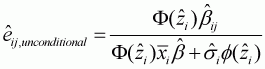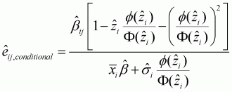 McDonald and Moffitt (1980) describe how total change in y can be disaggregated into two parts: the change in y above the threshold, weighted by the probability of being above the threshold; and the change in the probability of being above the threshold, weighted by the expected value of y. Unconditional elasticity describes the elasticity of y from the mean of all observed values for y. Conditional elasticity is the elasticity measure that is conditional on the consumer's choice to purchase a non-zero quantity of the good.