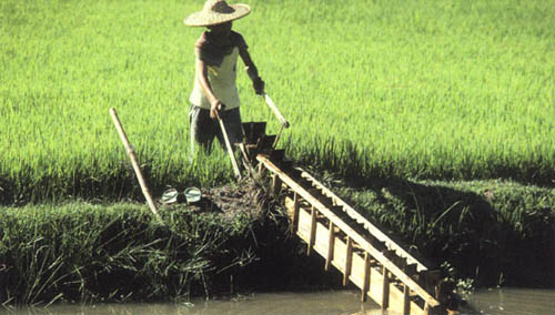Planche 15 Agriculteur utilisant une pompe manuelle pour prélever de leau dans un canal (Chine)