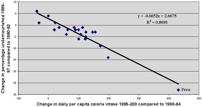 Figure 3. Change in average food availability vs. change in prevalence of undernutrition, sample countries during the 1990s.