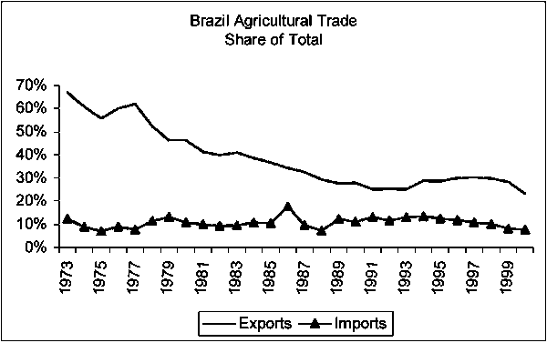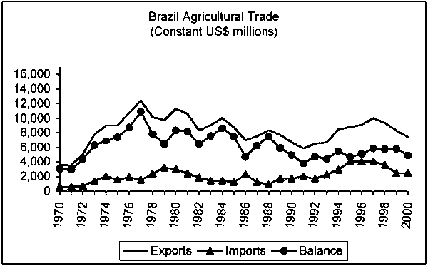 These transformations have been extended to trade policy as well. In the beginning of the 1990s, Brazil promoted a major reform of its tariffs and was already engaged in discussions with Argentina for the creation of a free trade area between the two countries. The abandonment of old protectionism in favour of a more liberal stance in trade policy has contributed further to enhance efficiency in the private sector and particularly in agriculture. There is still a long way to go on trade liberalization both in agriculture and in other sectors, but the depth of this process will depend significantly on the willingness of Brazilian trading partners to go along with liberalization and of the outcome of the multilateral trade negotiations.