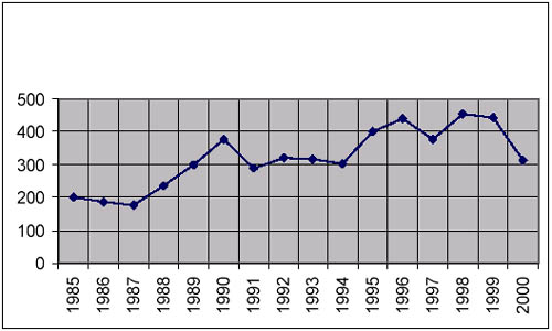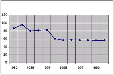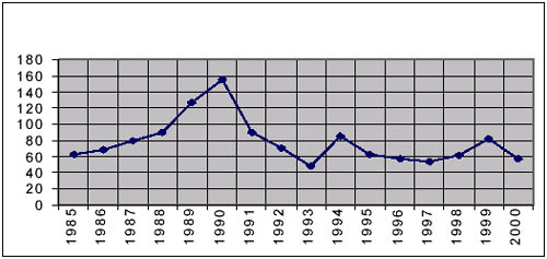 The government attempted in 1986-1988 to simplify the tariff structure by reducing to four the number of product categories while reducing the overall level of tariffs and non-tariff barriers to trade (import licensing, reference values, import bans, import monopolies covering sugar, rice and cement; World Bank, 1993). By 1988, the maximum tariffs were reduced and many exemptions removed. The range of tariffs narrowed from 0-190 percent to 0-128 percent. These reform measures resulted in a reduction in the average effective protection rate from 165 percent in 1985 to 89 percent in 1988 (UNDP/World Bank, 1993). Owing to a reduction in revenues and domestic opposition to the measures, some reversals occurred. In August 1989, customs duties were raised from 10 percent to 15 percent. A stamp duty of 3 percent was introduced in 1990. As a result, the average statutory rate of import taxes (combining customs and other taxes), which had been reduced from 98 percent in 1986 to 68 percent in 1988, rose again to 90 percent in 1991 (UNDP/World Bank, 1992).