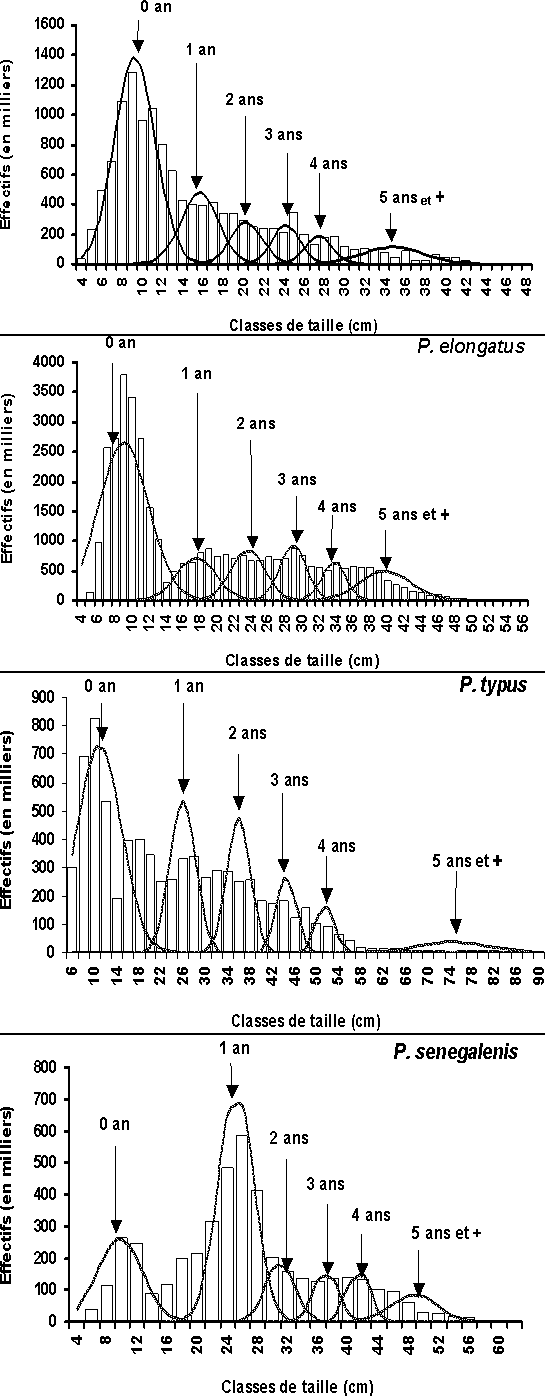 Par ailleurs, les effectifs capturés annuellement sont également estimés par groupe d'âge pour chaque espèce étudiée. La conversion taille/âge est effectuée par décomposition polymodale, sous l'hypothèse d'une loi de croissance déterminée. Etant donné qu'aucune différence de croissance n'est observée entre les femelles et les mâles au niveau de ces espèces, les estimations sont effectuées sans distinction de sexe.