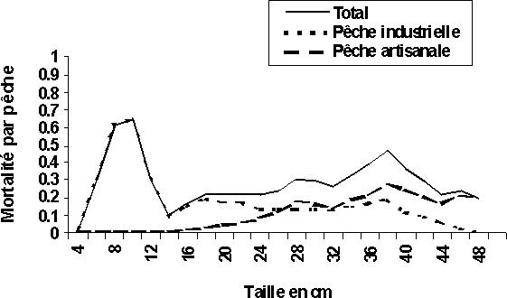 Les effectifs capturés annuellement sont donc estimés par classe de taille, pour la pêche artisanale et pour la pêche industrielle. Compte tenu du petit nombre d'années disponibles pour les quatre espèces, une première analyse est conduite sur une pseudo-cohorte. Les effectifs sont ainsi regroupés pour obtenir une distribution des captures totales par classe de taille, en valeur moyenne sur les cinq années (1995, 1996, 1997, 1998 et 1999) à partir de la relation suivante: