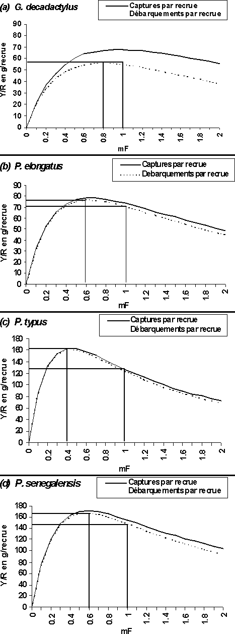 M*/2 (Pauly): En considérant la remarque faite par Sparre et Venema (1996), les résultats issus de la méthode de Pauly ont été divisés par 2. En effet ces auteurs notent que dans le cas de certaines espèces le résultat de Pauly semble être le double de ce qu'il devait être. Ce qui pourrait être le cas de ces quatre espèces compte tenu de leur longévité relative (supérieur à 5-7 ans).