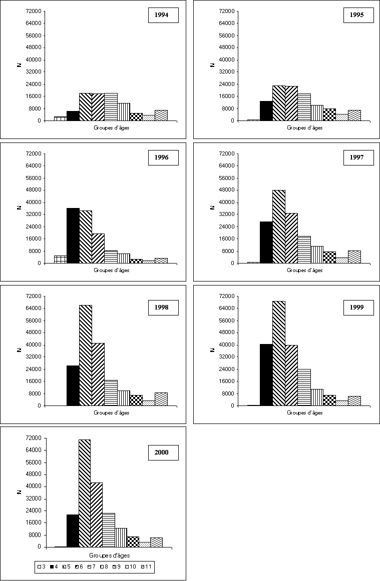 La décomposition polymodale des captures par classe de taille conduit à l'estimation des captures réalisées, chaque année, sur chaque cohorte (tableau 2, figure 4).