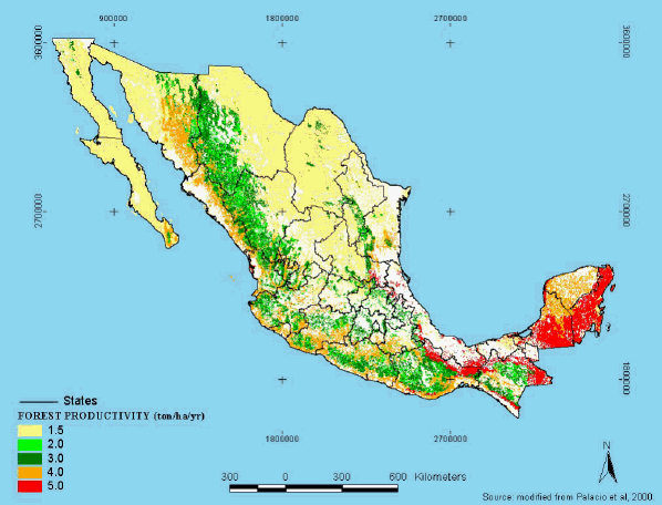 Figure 7. Assumed Biomass Productivities for Mexican Forests (ton/ha/yr)