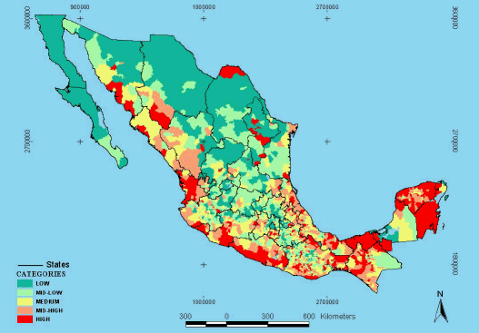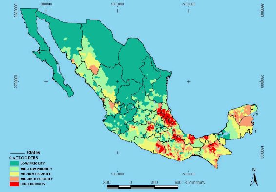 For each of the variables selected, “municipios” were grouped and ranked into 5 categories, reflecting the acuteness (or priority) of the problem:
