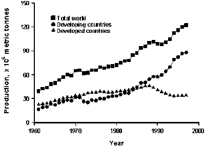 While aquaculture has been increasing for the last 20 years, the increment has dropped during the last five years. The total value of aquaculture and catches by 2000 was approx US$ 130 000 million and total world trade of fish and fishery products increased in 2000 to r each US$ 54 000 million for exports. Thailand is the main exporting country with US$ 4 300 million. China experienced a sharp increase in its export performance. It is now number two among all fish exporting countries with US$ 3 700 million. The Chinese fisheries exporting industry is specializing in re-processing of imported raw material, creating a strong value-addition in this process. Norway, which used to be number two fish exporter in previous years, reported lower export values. This is in part due to lower salmon prices, but also caused by low value of the euro - the currency of the main trading area for Norwegian fish. Almost two thirds of the total world production is produced by or caught in developing countries (Figure 2.1).