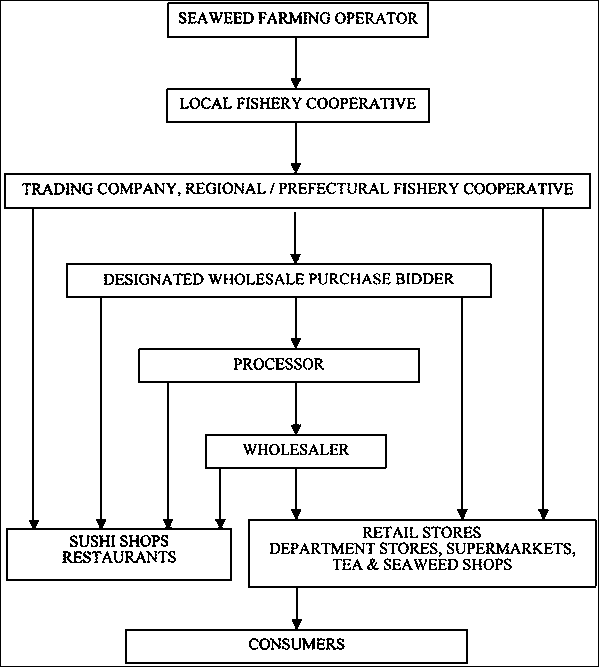 The distribution and marketing chain for nori and other Japanese seaweeds is illustrated in Figure 49. Dried nori is in constant oversupply in Japan and producers and dealers are trying to encourage its use in United States of America and other countries. Production and markets in China are expanding, although the quality of the product is not always as good as that from the Republic of Korea and Japan. Good quality nori is in demand in the Republic of Korea.