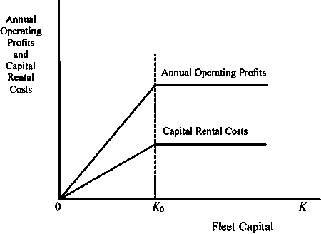 Total fleet annual net profits obviously achieve a maximum at K = K0. Suppose that actual K > K0. Fleet annual operating profits and 'rental' costs, and thus net profits, would be identical to what they would have been, had actual K = K0. The basic reason is that, in this situation, the 'rental' cost of capital is really another form of operating cost. Hence suppose for the moment that K0 = 200 and Dmax = 360 days. Then suppose that K was doubled to 400 and as a consequence D was reduced to 180 days. The total annual fleet costs, total revenue, and thus annual net profits would remain unchanged[11].