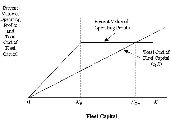 Now consider Figure 2, which shows the present value of fleet operating profits and the total capital cost of fleet acquisition, c1K. The present value of resource rent is, not surprisingly, maximized at K=K0, where it will be recalled that K0 is given by[12]: