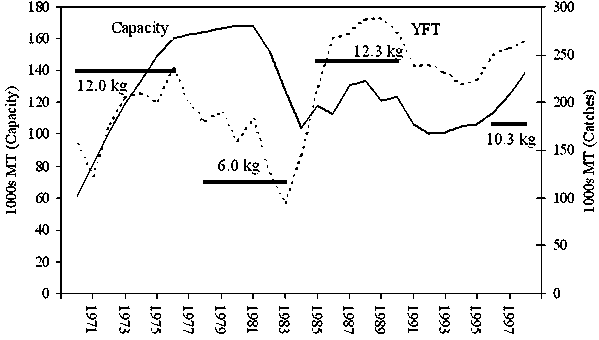 Almost the same situation occurred previously in the tuna fishery of the EPO. In 1966, the governments with vessels participating in the fishery implemented a conservation programme for yellowfin in the EPO, in the form of an annual total allowable catch. The programme was quite successful in maintaining a high abundance of yellowfin until the mid-1970s, when the growing size of the fleet began to cause problems. In 1970, the capacity of the international purse-seine fleet[78] in the EPO was about 60 000 tonnes, and the catch of yellowfin averaged about 100 000 tonnes. The demand for tuna for canning and the prices paid to fishermen were increasing. This stimulated the building of new vessels, and the capacity of the fleet increased to about 160 000 tonnes by 1976, and 170 000 tonnes by 1981 (Figure 1). Prior to 1975, the fleet had been concentrating on large yellowfin associated with dolphins, and the average weight of the fish in the catch was about 12 kg. After peaking at 240 000 tonnes in 1976, the catch began to decline.