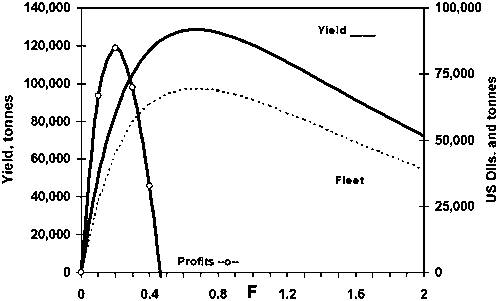 If a single year of catch data is used, then a single F estimate value is made. Once the series of parameter values required are put in, the model estimates the potential yield under a series of F values, which is graphically shown on the screen, often describing a parabola. This way it is possible to determine the potential yield as a function of fishing mortality. Depending upon these key variables, the fleet size required to obtain a particular yield can be determined. This yield may be the maximum sustainable yield (MSY), or the optimum economic yield (OEY), corresponding to the F value giving the highest profits. If the study case is a stock whose age of first capture is larger than age of sexual maturity, then a yield parabola is found whose maximum value is usually located at F levels higher than the former one with a fleet size which is different from that required to achieve the OEY.
