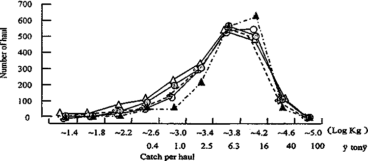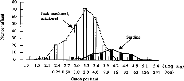 The target species for the examined coastal purse seine were jack mackerel, mackerel and sardine. The nets used during the studied period were some 672m in cork line length and 195m deep. The nets for respective target species were similar in size, despite the deference in mesh size. The frequency distribution of catch per haul is shown in Figure 2. For the purposes of the analysis, empty hauls (which occurred in ten percent of the cases when targeting jack mackerel and mackerel) were excluded from the analysis. The catches per haul for jack mackerel and mackerel ranged from 0.06 tonnes to 10.4 tonnes, and those of sardine from 0.8 tonnes to 130 tonnes. The largest amount of catch per haul was 173 times greater than the smallest for jack mackerel and mackerel and 163 times greater, for sardine. The largest amount of catch per haul occurred only once or twice a year. The statistical distribution patterns of the catch per haul for the three fishes were similar to those for walleye pollock from the trawlers.