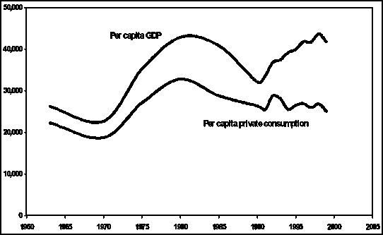 Figure 3.3 Per capita GDP and private consumption (Syrian Pounds at 1995 prices)